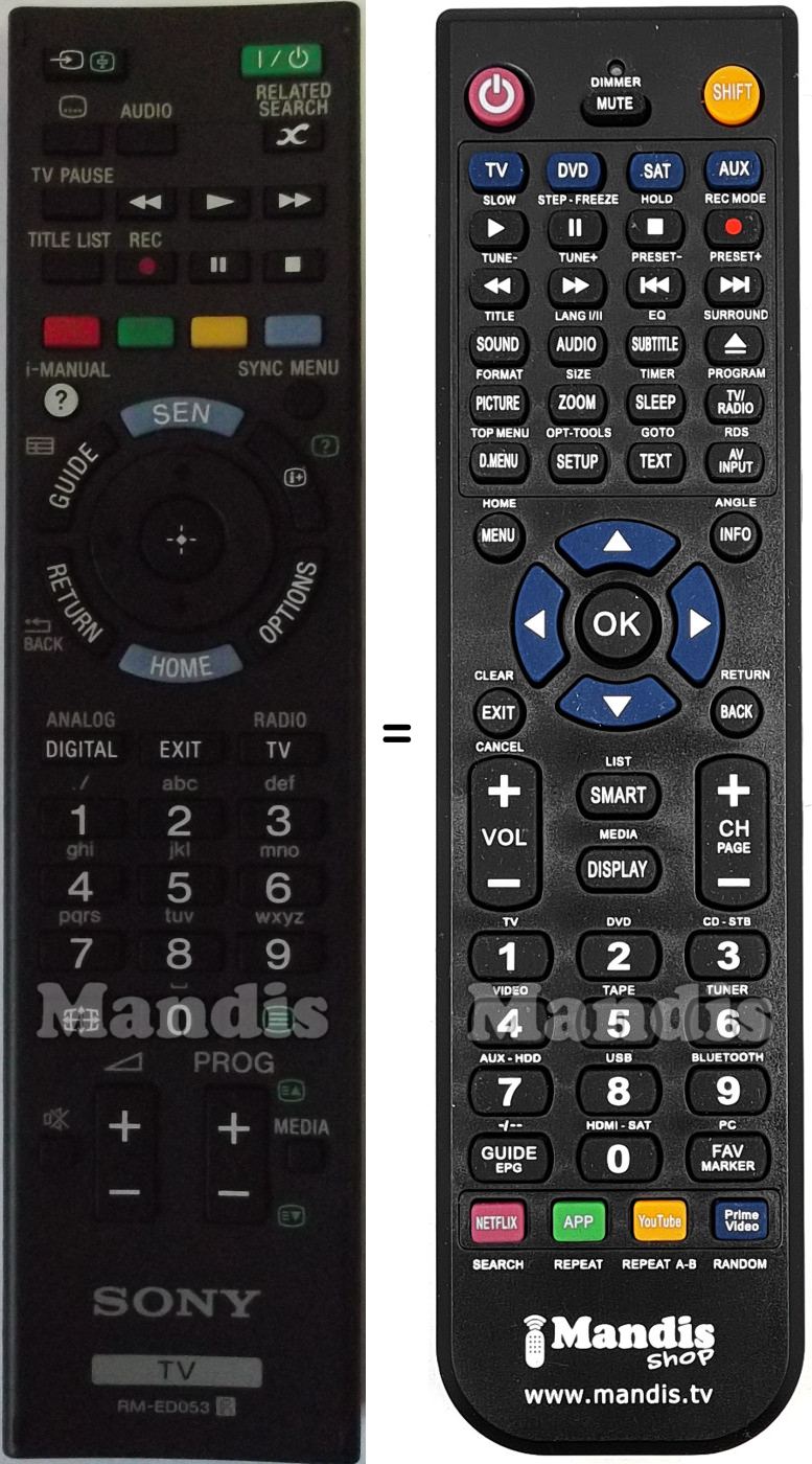 Below, we will show you the correspondence between each button on the original remote control and the button that performs the same function on the replacement remote control. In some cases, you may need to press the SHIFT key before pressing another button to perform certain actions. These additional functions are often not widely used and are included to facilitate understanding of the replacement remote control, or because the original remote control has more buttons than its equivalent.