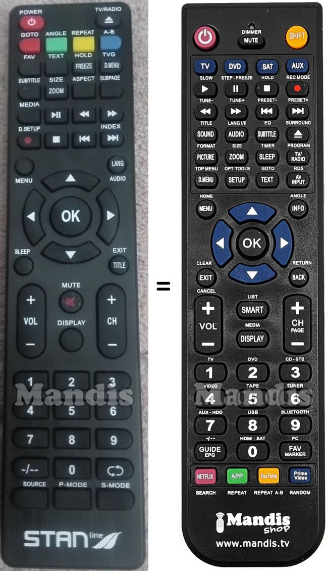 Below, we will show you the correspondence between each button on the original remote control and the button that performs the same function on the replacement remote control. In some cases, you may need to press the SHIFT key before pressing another button to perform certain actions. These additional functions are often not widely used and are included to facilitate understanding of the replacement remote control, or because the original remote control has more buttons than its equivalent.