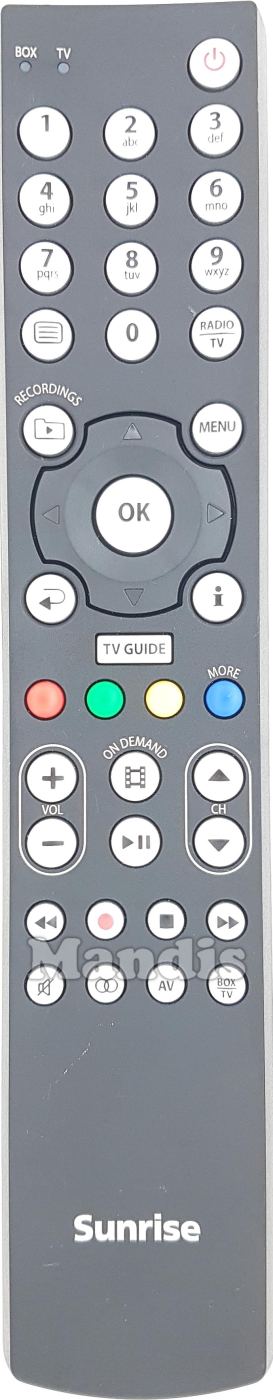 Power, 1, 2, 3, 4, 5, 6, 7, 8, 9, 0, [=], Radio/TV, Menu, Recordings, i, Back, Up, Down, Right, Left, OK, Tv Guide, Red, Green, Yellow, Blue/More, On Demand, Play/Pause, Vol+, Vol-, CH+, CH-, <<, Rec, Stop, >>, Mute, OO, AV, Box/Tv