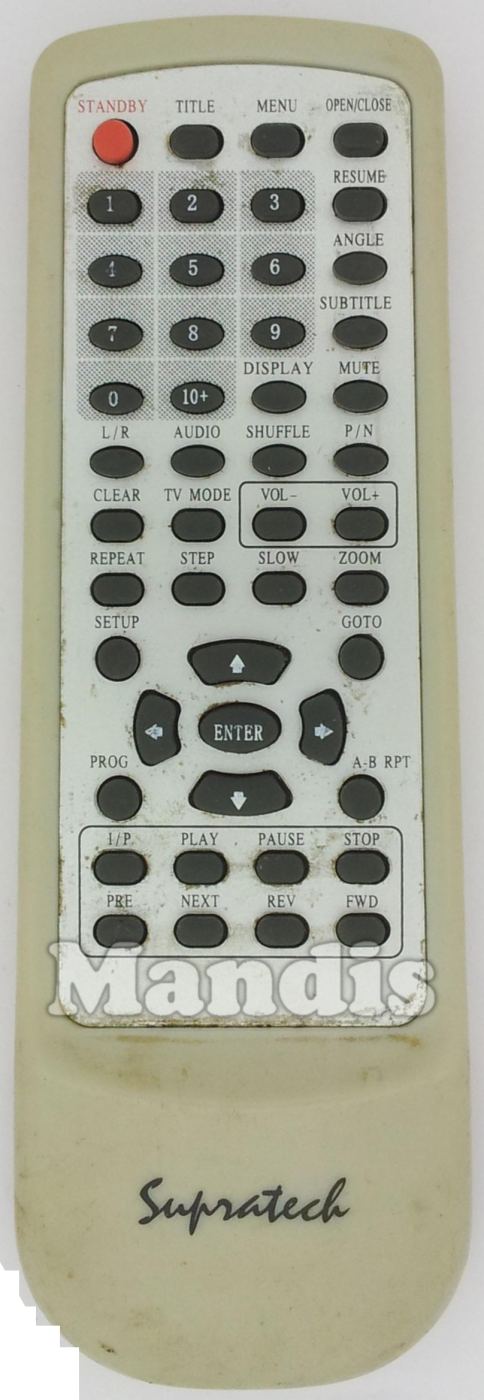 Standby, Title, Menu, Open/Close, 1, 2, 3, 4, 5, 6, 7, 8, 9, 0, 10+, Resume, Angle, Subtitle, Mute, Display, Shuffle, P/N, Audio, L/R, Clear, Tv Mode, Vol-, Vol+, Slow, Zoom, Step, Repeat, Setup, Goto, Prog, Up, Down, Right, Left, Enter, A-B RPT, I/P, Play, Pause, Stop, FWD, REV, Next, Pre