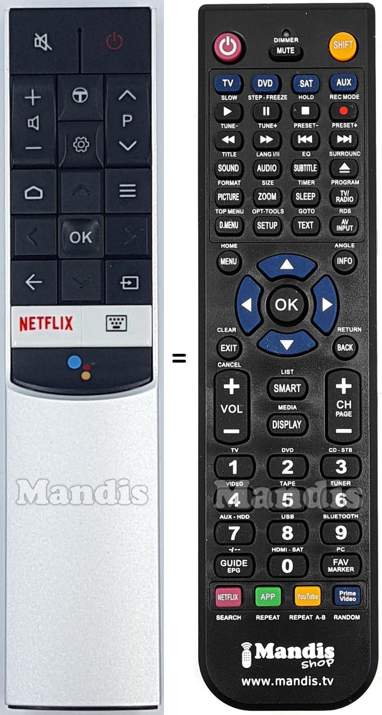 Below, we will show you the correspondence between each button on the original remote control and the button that performs the same function on the replacement remote control. In some cases, you may need to press the SHIFT key before pressing another button to perform certain actions. These additional functions are often not widely used and are included to facilitate understanding of the replacement remote control, or because the original remote control has more buttons than its equivalent.