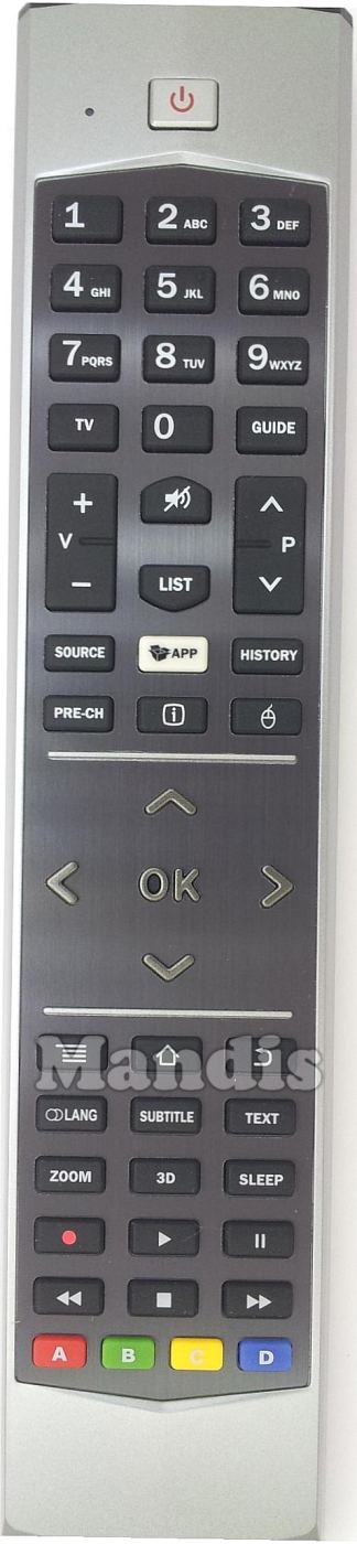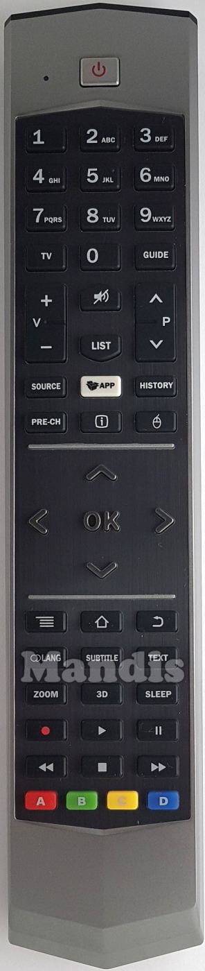 Power, 1, 2, 3, 4, 5, 6, 7, 8, 9, 0, TV, Guide, Mute, List, Vol+, Vol-, P+, P-, Source, APP, History, Pre-CH, [i], Up, Down, Right, Left, OK, ·=, Home, Back, Lang, Subtitle, Text, Zoom, 3D, Sleep, Rec, Play, Pause, Stop, <<, >>, Red, Green, Yellow, Blue