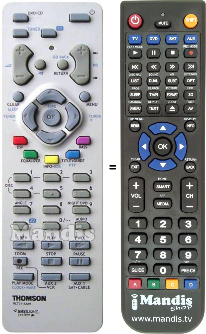 This remote control replaces most of the functions of your RCT 311 AAM 1 (21276520). It is not a universal remote control, but a copy with most of the buttons and functions of your original.