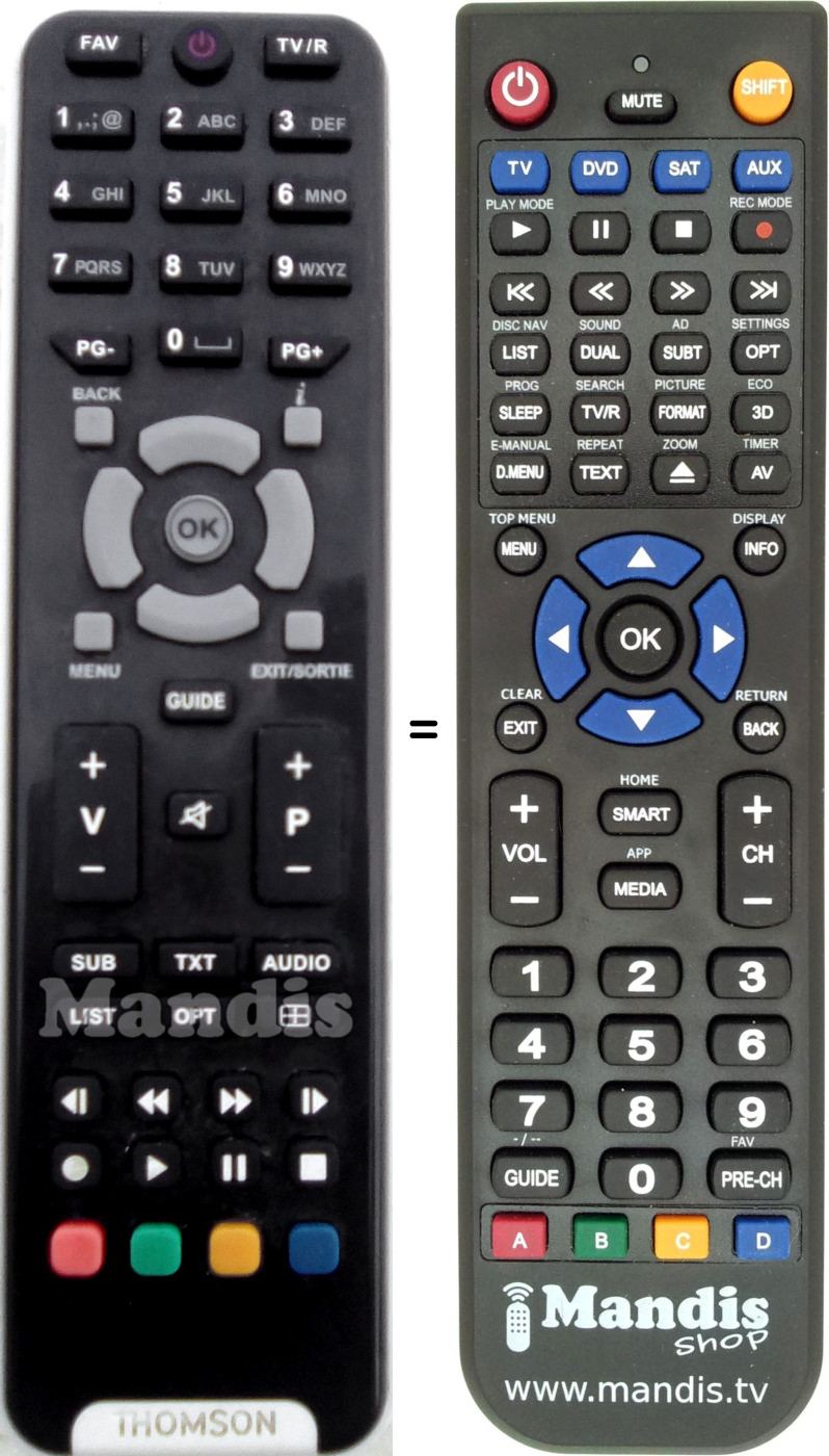 Below, we will show you the correspondence between each button on the original remote control and the button that performs the same function on the replacement remote control. In some cases, you may need to press the SHIFT key before pressing another button to perform certain actions. These additional functions are often not widely used and are included to facilitate understanding of the replacement remote control, or because the original remote control has more buttons than its equivalent.
