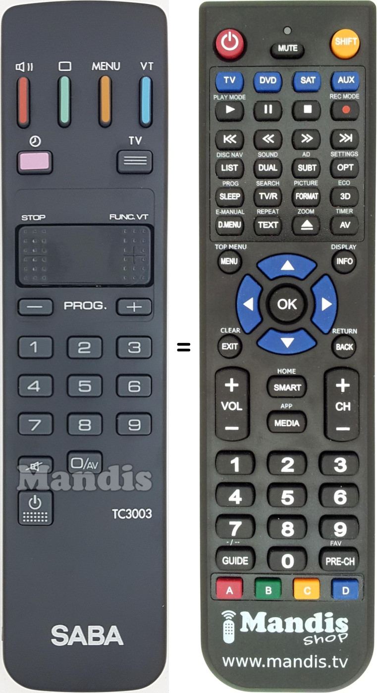 Below, we will show you the correspondence between each button on the original remote control and the button that performs the same function on the replacement remote control. In some cases, you may need to press the SHIFT key before pressing another button to perform certain actions. These additional functions are often not widely used and are included to facilitate understanding of the replacement remote control, or because the original remote control has more buttons than its equivalent.