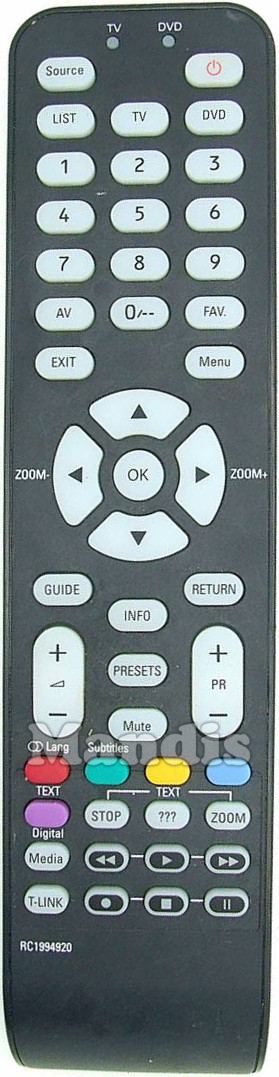 power, source, list, tv, dvd, 1, 2, 3, 4, 5, 6, 7, 8, 9, 0, AV, FAV, EXIT, MENU, GUIDE, RETURN, OK, UP, DOWN, RIGHT, LEFT, VOL+, VOL-, PR+, PR-, INFO, PRESETS, MUTE, RED, GREEN, YELLOW, BLUE, TEXT, DIGITAL MEDIA, T-LINK, STOP TEXT, ??? Text, Zoom Text, <<, PLAY, >>, REC, STOP, PAUSE