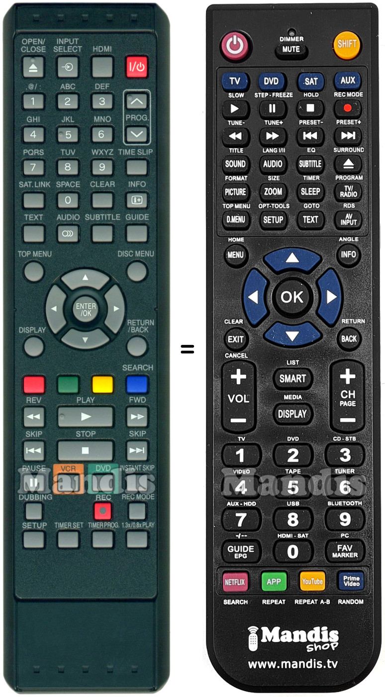 This remote control performs all the functions of the original remote control: Power, Open / Close, Input Select, HDMI, 1, 2, 3, 4, 5, 6, 7, 8, 9, 0, Prog +, Prog -, Time Slip, Sat. Link, Clear, Info, Text, Audio, Subtitle, Guide, Top Menu, Disc Menu, Display, Return / Back, Up, Down, Right, Left, Enter / Ok, Red, Green, Yellow, Blue / Search, <<, Play, >>, I<<, Stop, >>I, Pause, VCR, DVD, Instant Skip, Dubbing, Rec, Rec Mode, Setup, Timer Set, Timer Prog, 1.3x/0.8x Play