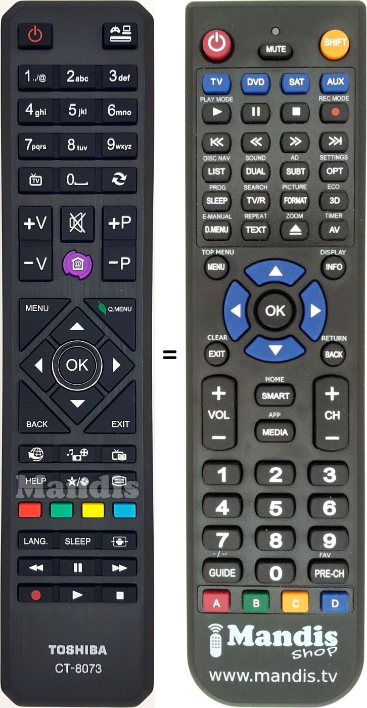 Below, we will show you the correspondence between each button on the original remote control and the button that performs the same function on the replacement remote control. In some cases, you may need to press the SHIFT key before pressing another button to perform certain actions. These additional functions are often not widely used and are included to facilitate understanding of the replacement remote control, or because the original remote control has more buttons than its equivalent.