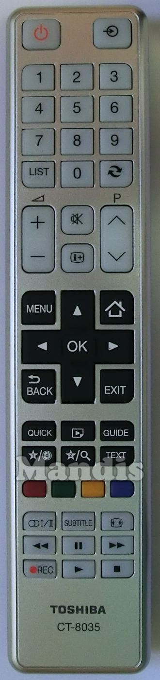 original remote control CT-8035 (75037328) used for televisions for the brand Toshiba. This is an original remote control.