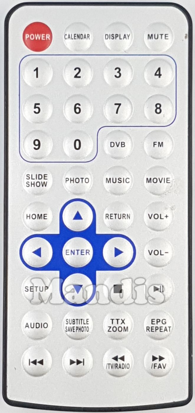 POWER, CALENDAR, DISPLAY, MUTE, 1, 2, 3, 4, 5, 6, 7, 8, 9, 0, DVB, FM, SLIDE SHOW, PHOTO, MUSIC, MOVIE, HOME, UP, ENTER, DOWN, RIGHT, LEFT, RETURN, VOL+, VOL-, SETUP, STOP, PLAY/PAUSE, AUDIO, SUBTITLE, TTX/ZOOM, EPG/REPEAT, I<<, >>I, <</TV/RADIO, >>/FAV