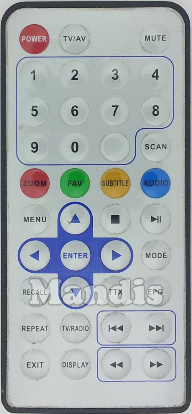 POWER, TV/AV, MUTE, 1, 2, 3, 4, 5, 6, 7, 8, 9, 0, SCAN, RED/ZOOM, GREEN/FAV, YELLOW/SUBTITLE, BLUE/AUDIO, MENU, STOP, PLAY/PAUSE, ENTER, UP, DOWN, RIGHT, LEFT, MODE, RECALL, TTX, EPG, REPEAT, TV/RADIO, EXIT, DISPLAY, I<<, >>I, <<, >>, Nothing