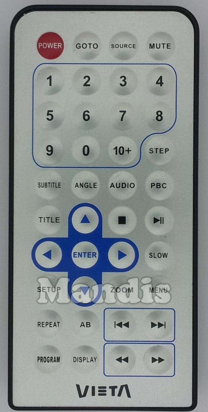 Power, Goto, Source, Mute, 1, 2, 3, 4, 5, 6, 7, 8, 9, 0, 10+, Step, Subtitle, Angle, Audio, PBC, Title, Up, Stop, Play/Pause, Left, Enter, Right, Slow, Setup, Down, Zoom, Menu, Repeat, A-B, I<<, >>I, Program, Display, <<, >>
