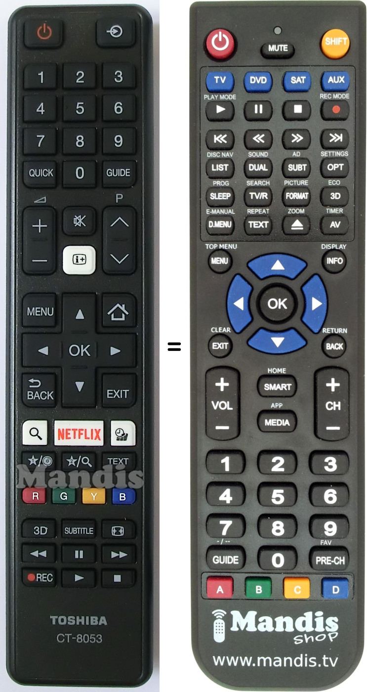 Below, we will show you the correspondence between each button on the original remote control and the button that performs the same function on the replacement remote control. In some cases, you may need to press the SHIFT key before pressing another button to perform certain actions. These additional functions are often not widely used and are included to facilitate understanding of the replacement remote control, or because the original remote control has more buttons than its equivalent.