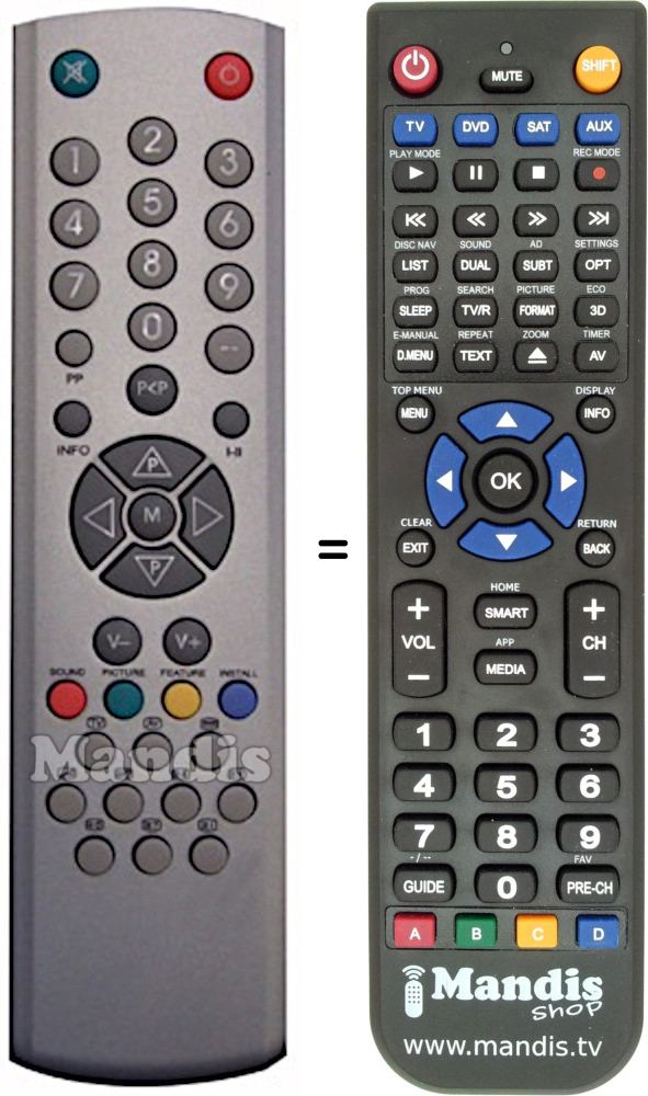 Below, we will show you the correspondence between each button on the original remote control and the button that performs the same function on the replacement remote control. In some cases, you may need to press the SHIFT key before pressing another button to perform certain actions. These additional functions are often not widely used and are included to facilitate understanding of the replacement remote control, or because the original remote control has more buttons than its equivalent.