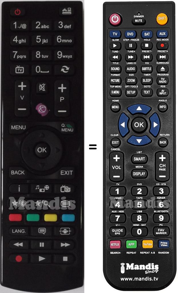 Below, we will show you the correspondence between each button on the original remote control and the button that performs the same function on the replacement remote control. In some cases, you may need to press the SHIFT key before pressing another button to perform certain actions. These additional functions are often not widely used and are included to facilitate understanding of the replacement remote control, or because the original remote control has more buttons than its equivalent.