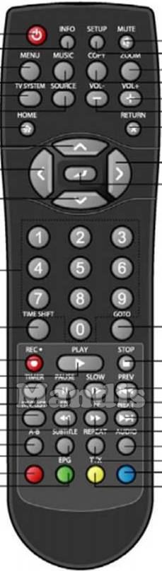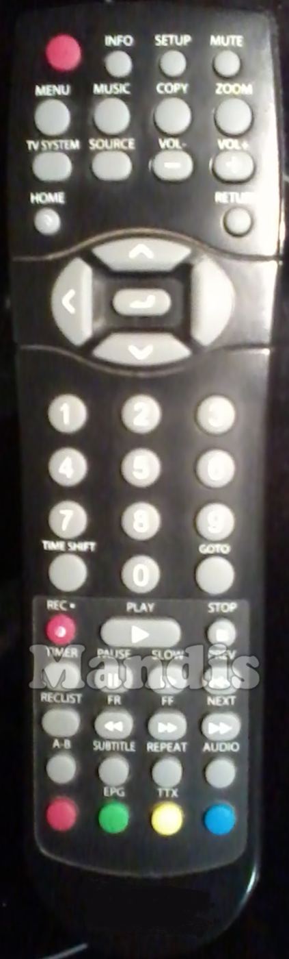 Power, Info, Setup, Mute, Menu, Music, Copy, Zoom, TV System, Source, Vol -, Vol +, Home, Return, Up, Down, Right, Left, Enter, 1, 2, 3, 4, 5, 6, 7, 8, 9, 0, Time Shift, GOTO, REC, Play, Stop, Timer, Pause, Slow, Reclist, FR <<, FF >>, Prev I<<, Next >>I, A - B, Subtitle, Repeat, Audio, Red, Green / EPG, Yellow / TTX, Blue