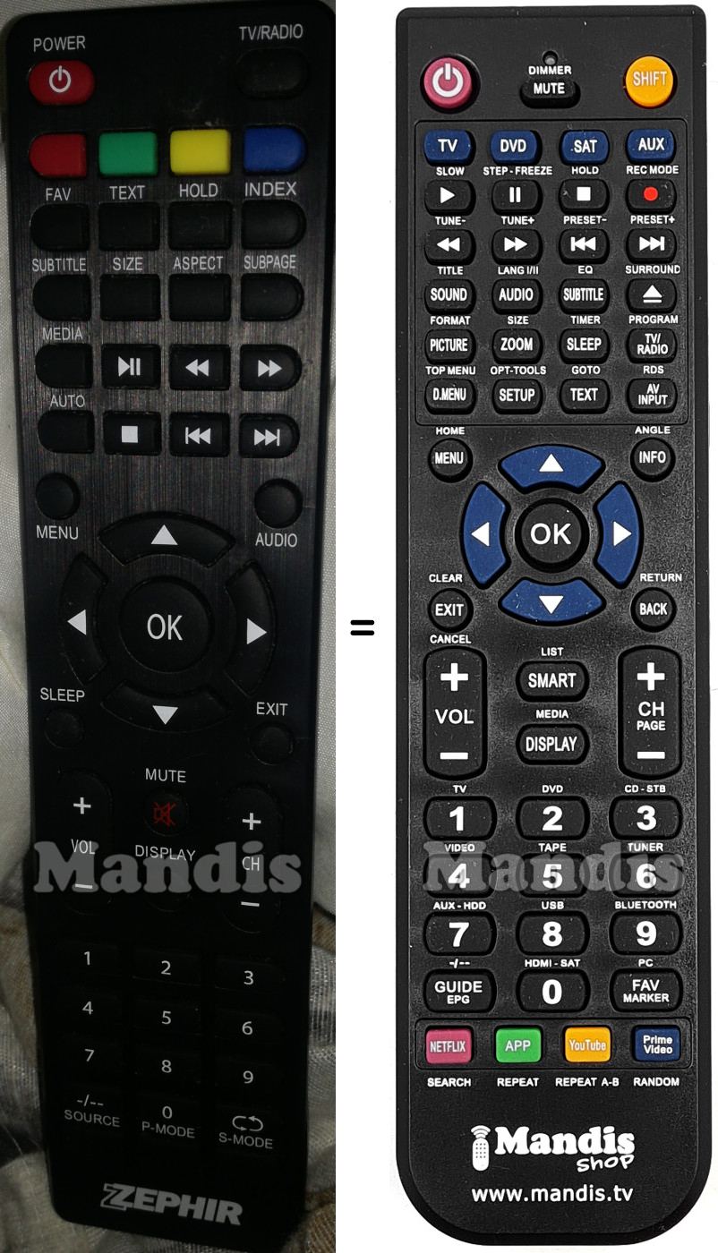 Below, we will show you the correspondence between each button on the original remote control and the button that performs the same function on the replacement remote control. In some cases, you may need to press the SHIFT key before pressing another button to perform certain actions. These additional functions are often not widely used and are included to facilitate understanding of the replacement remote control, or because the original remote control has more buttons than its equivalent.