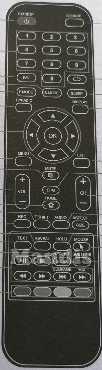 Standby, Source, 1, 2, 3, 4, 5, 6, 7, 8, 9, 0, FAV, Recall, P.Mode, S.Mode, Sleep, TV / Radio, Display, Up, Left, OK, Right, Down, Menu, Exit, Mute, EPG, Home, Vol+, Vol-, CH+, CH-, Rec, T.Shift, Audio, Size / Aspect, Text, Reveal, Hold, Mouse, Play/Pause, Stop, Index / RecList, Subtitle, <<, >>, I<< / Subpage, >>I / Mix, Red, Green, Yellow, Blue
