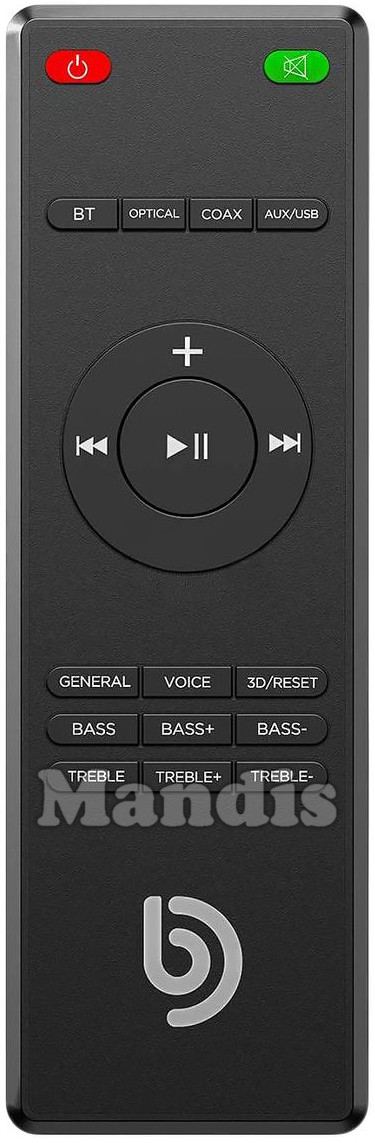 Power, Mute, BT, OPTICAL, COAX, AUX / USB, +, -, I<<, >>I, Play/Pause, General, Voice, 3D/Reset, Bass, Bass+, Bass-, Treble, Treble+, Treble-