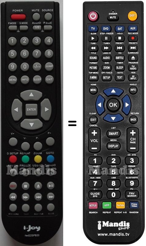 Below, we will show you the correspondence between each button on the original remote control and the button that performs the same function on the replacement remote control. In some cases, you may need to press the SHIFT key before pressing another button to perform certain actions. These additional functions are often not widely used and are included to facilitate understanding of the replacement remote control, or because the original remote control has more buttons than its equivalent.