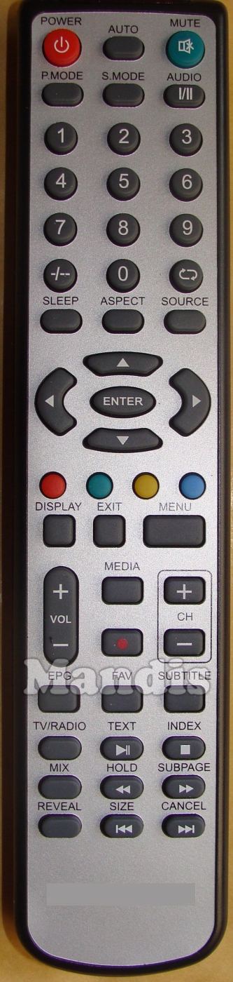 power, auto, mute, p.mode, s.mode, i/ii/audio, 1, 2, 3, 4, 5, 6, 7, 8, 9, 0, -/--, recall, sleep, aspect, source, enter, up, down, right, left, Red/Eject, Green/D.Menu, Yellow/Setup, Blue/D.Disp, display, exit, menu, vol+, vol-, media, rec, ch+, ch-, epg, fav, subtitle, tv/radio, text, index, mix, hold, subpage, repeat, i<<, >>i